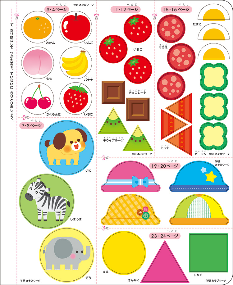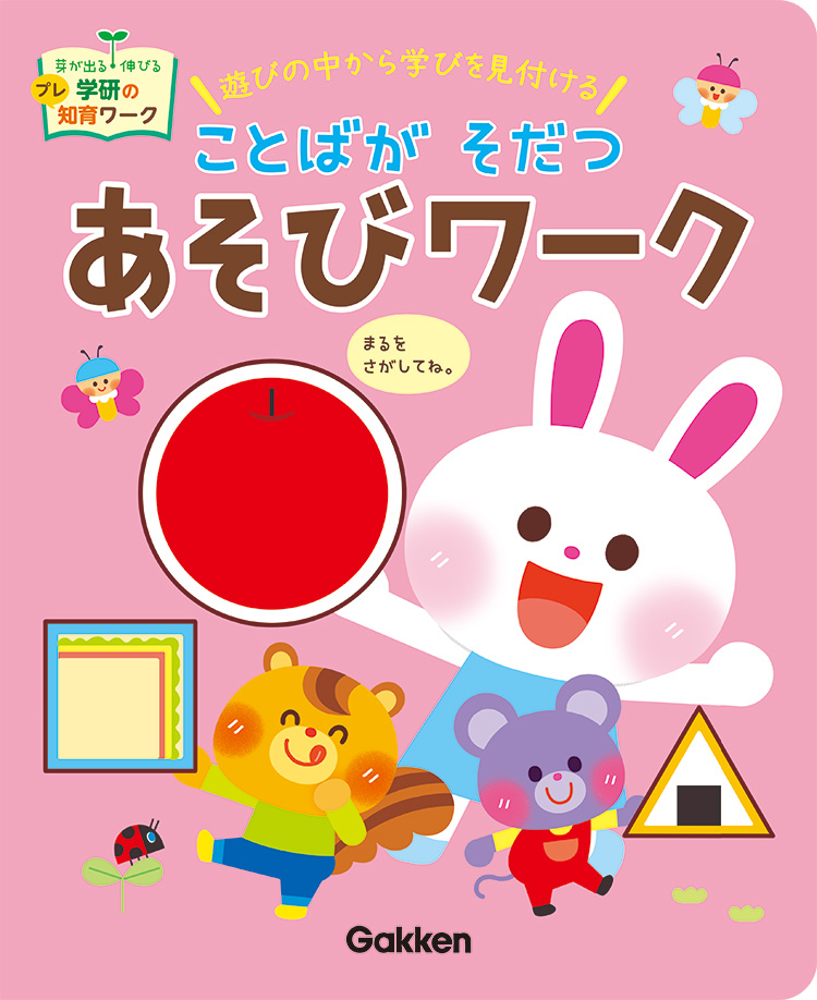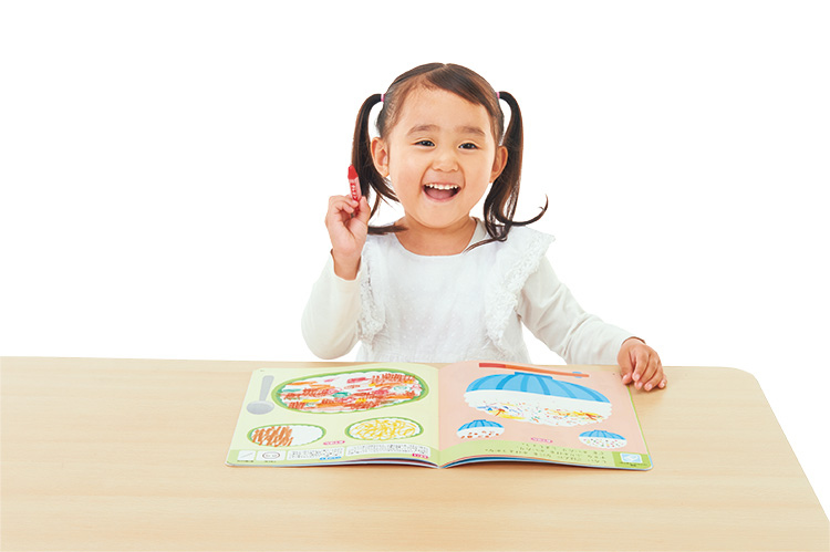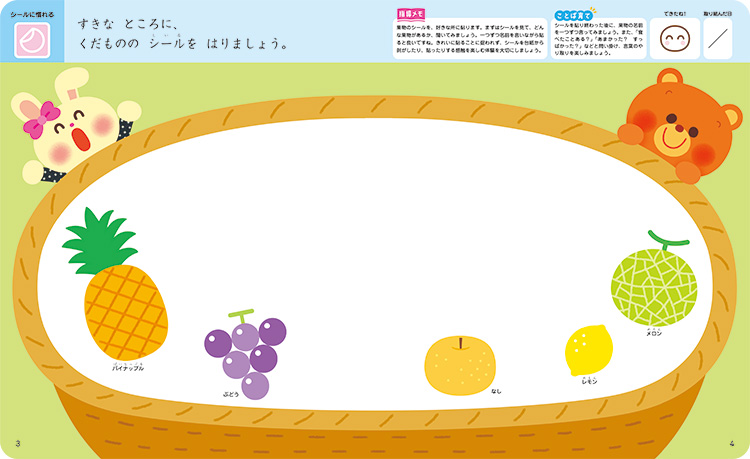 「学び」の初めとして、遊びながら楽しく取り組めるワークです。「言葉を育てる」ことを主軸に、シールとクレヨンを交互に使って取り組める構成になっています。