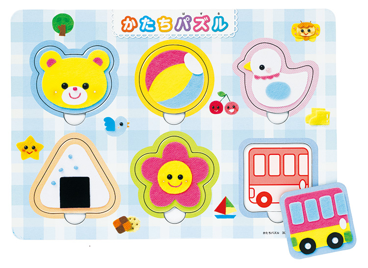 はじめてのパズルにぴったりの6ピースパズルです。ピースが物の形になっていて、ピースの下には同じ絵があるのでヒントになります。はじめてパズルで遊ぶ子どもが、形にふれながら、簡単に完成させることができます。裏面ではピースと同じ絵を探す絵合わせ遊びができます。片づけに便利なチャック袋付。