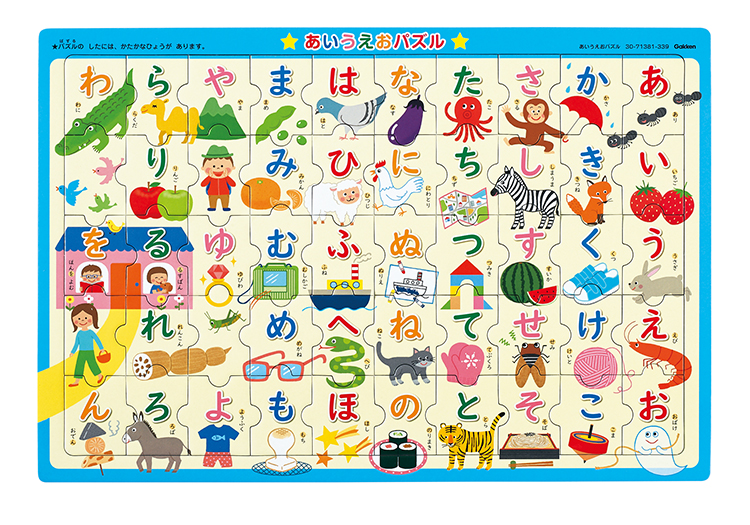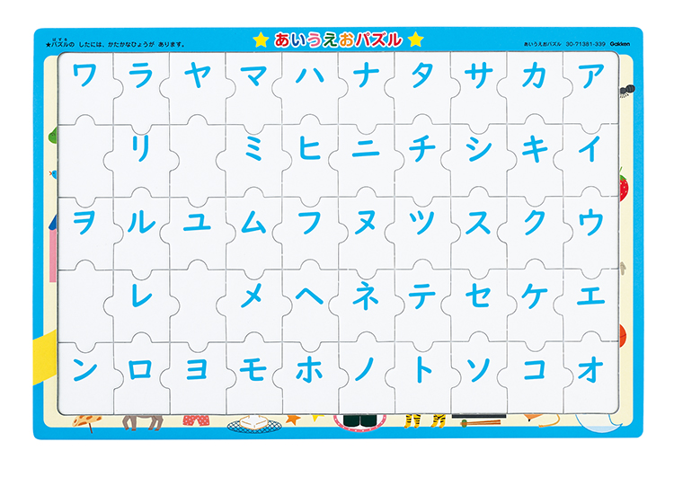 完成するとひらがな表になります。パズルの下面はかたかな表になっています。片づけに便利なチャック袋付。