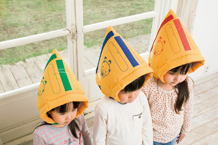 地震が起こったとき、慌てずに子どもたちを守るための工夫をたくさん盛り込んだ防災ずきんです。色は3色。クラスや学年で色分けして使えば、避難・誘導が迅速に行えます。名前欄は上部に2か所。上からはもちろん、左右どちらからも確認できます。難燃繊維を使用しています。