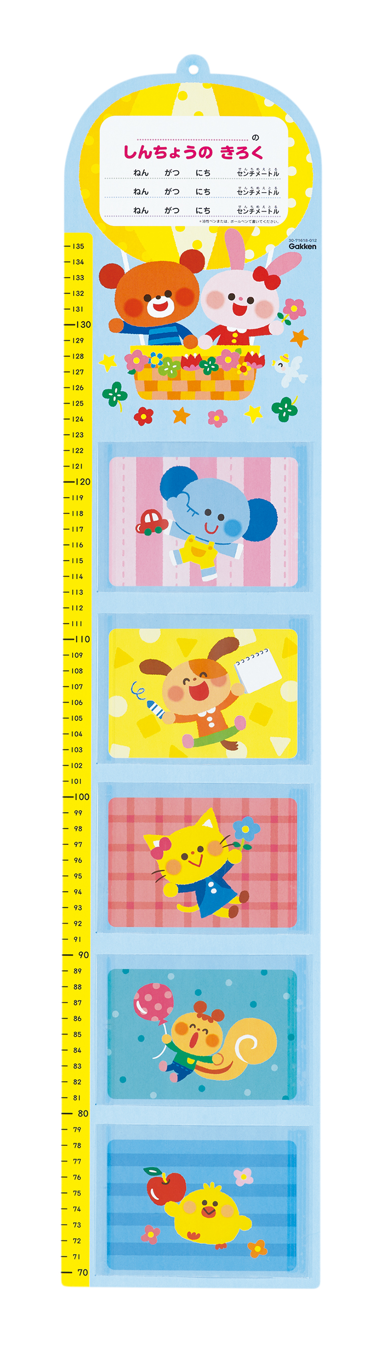 70 ~135cm まで1cm 単位で測れる身長計です。透明ポケットに5 枚の写真が飾れます。身長記録欄・透明ポケット5 枚付