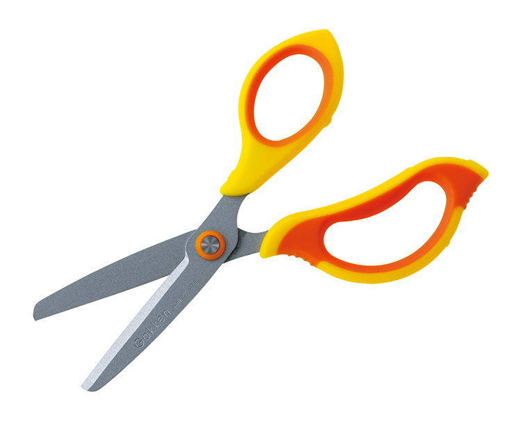 小さな動きで大きく開く、小さな手でも使いやすいはさみです。指が当たる部分が柔らかいので、手に馴染み、しっかり持つことができます。テープやのりのついた紙を切ってもべたべたしないフッ素加工刃を使用しています。