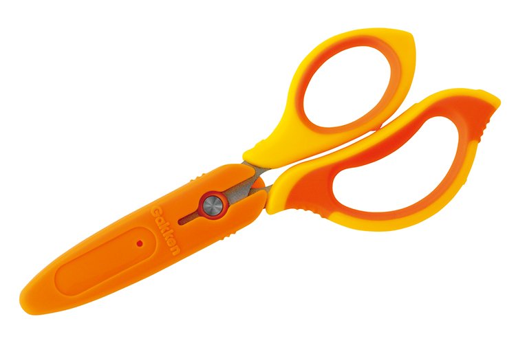 小さな動きで大きく開く、小さな手でも使いやすいはさみです。指が当たる部分が柔らかいので、手に馴染み、しっかり持つことができます。テープやのりのついた紙を切ってもべたべたしないフッ素加工刃を使用しています。