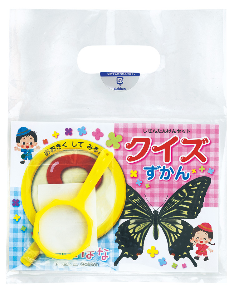 自然の中で見つけた虫や花を、虫めがねで観察したり、図鑑で調べたりできるセットです。自然に対する興味・関心が深まります。手さげポリ袋入
