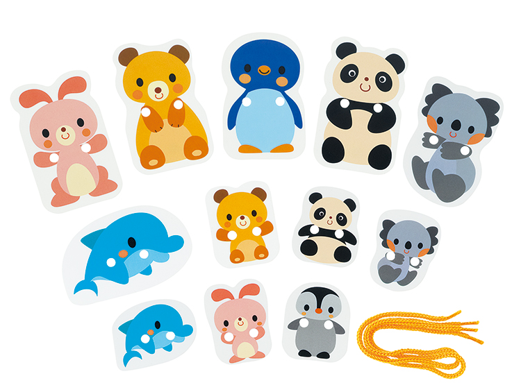 動物の親子のカードにひもを通して遊びます。親子でつなげたり、一列につなげたりして遊べます。手指の運動、集中力の育成になります。プラケース入