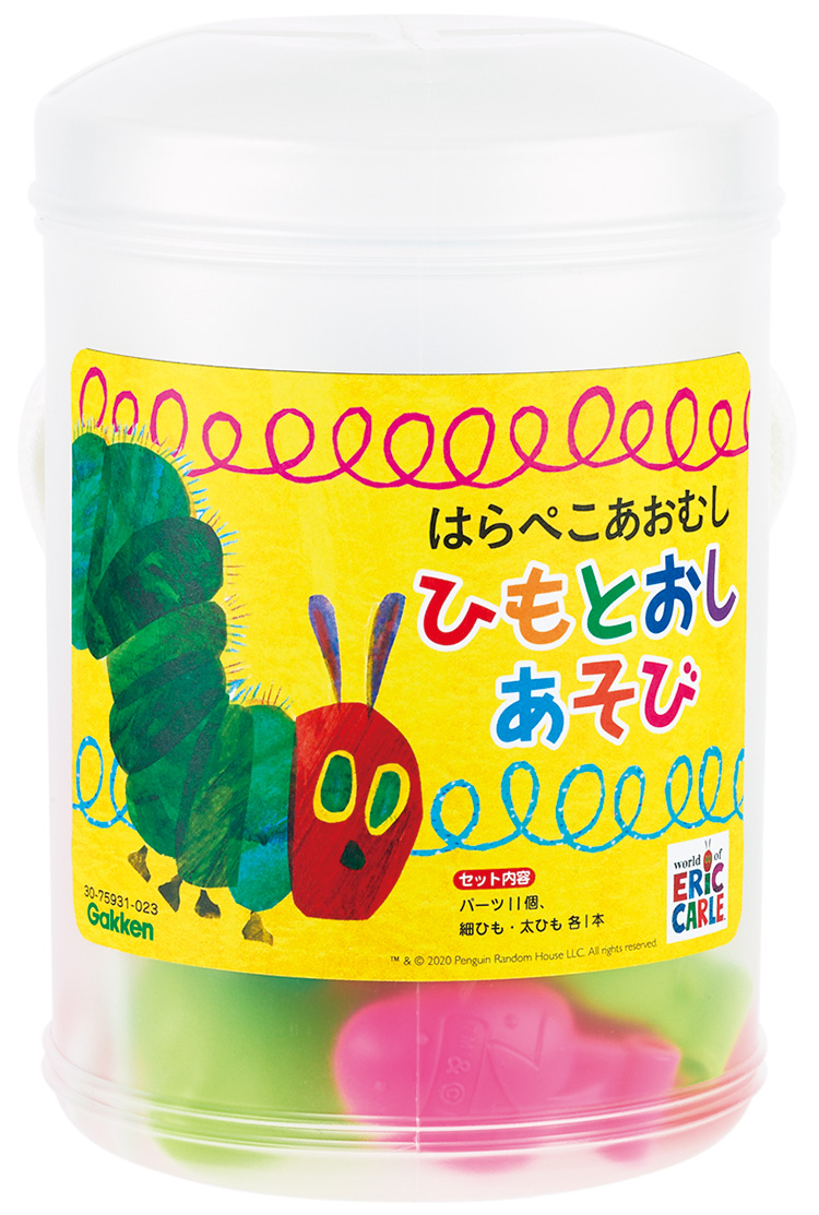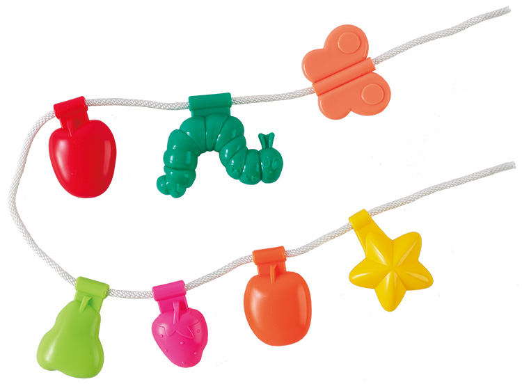 パーツの穴にひもを通して遊びます。はらぺこあおむしとフルーツのパーツが入っています。