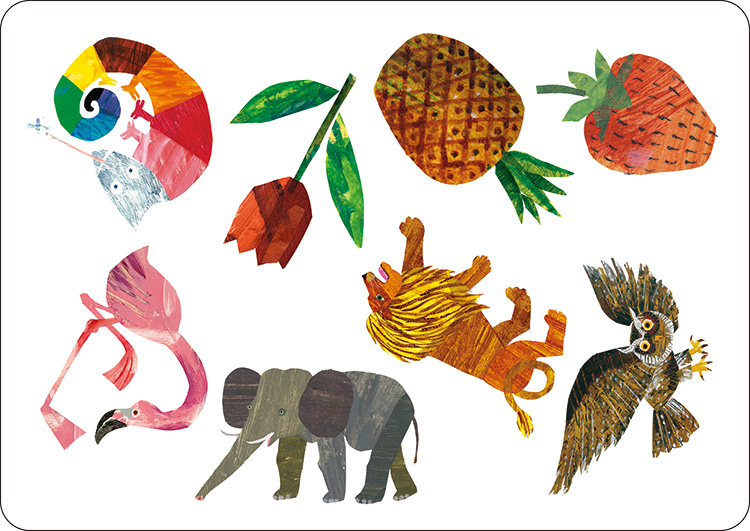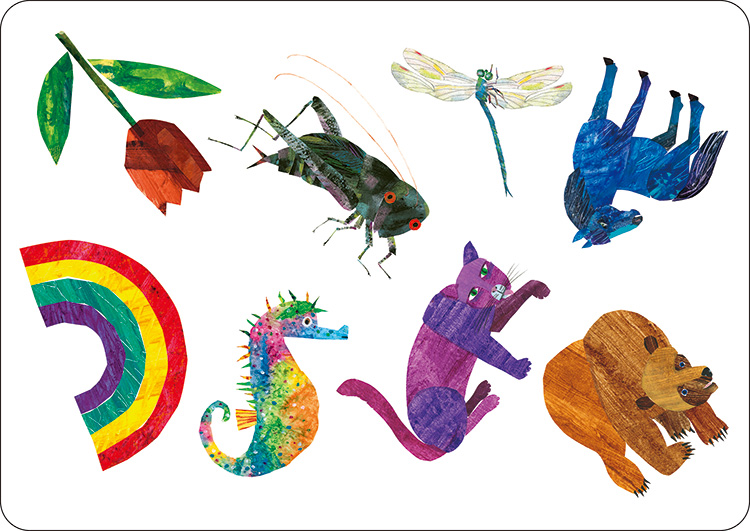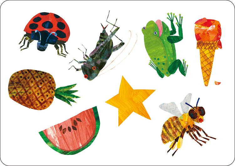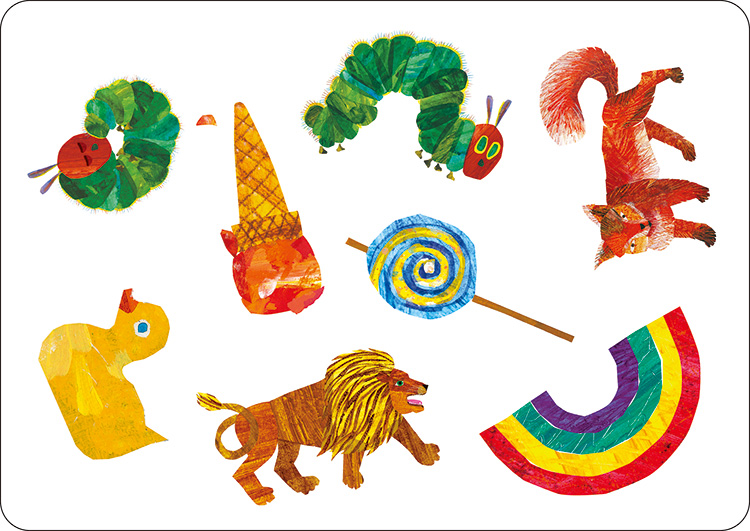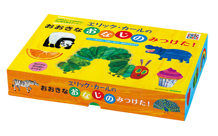 8つの絵が描かれたカードを2枚使って、その中から1つだけある同じ絵を探すカードゲームです。大人気絵本「はらぺこあおむし」を含む、エリック・カールの人気絵本のイラストが大集合。大きなカードなので、みんなで遊べて盛り上がります。