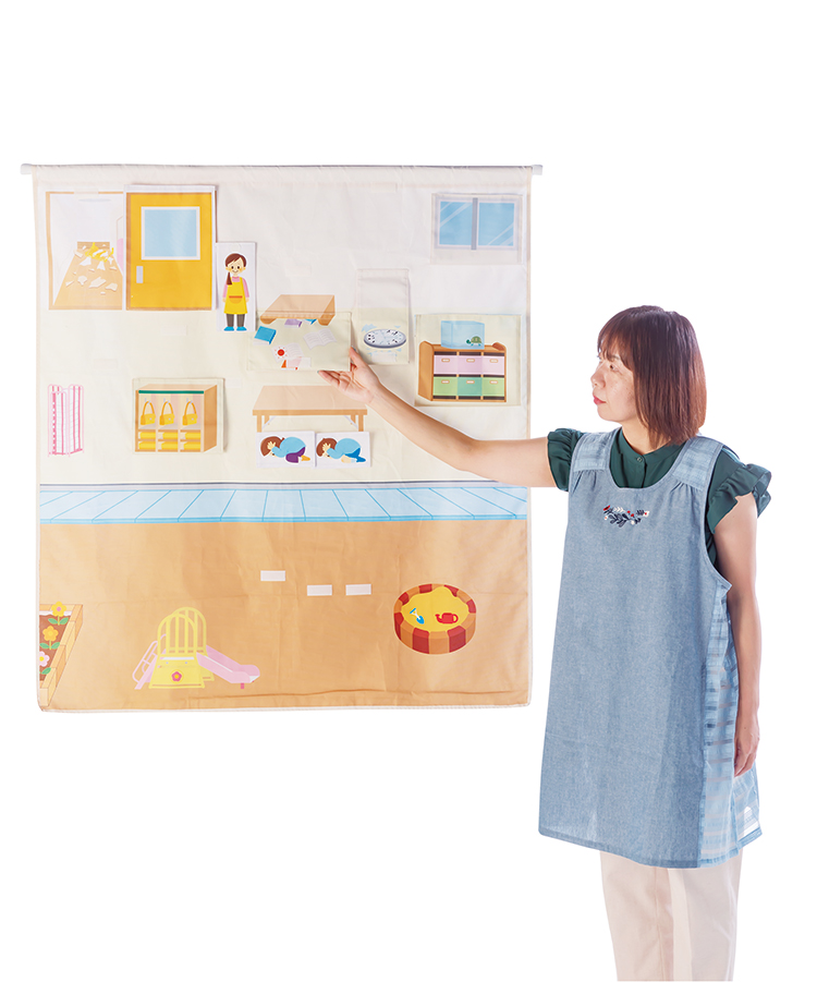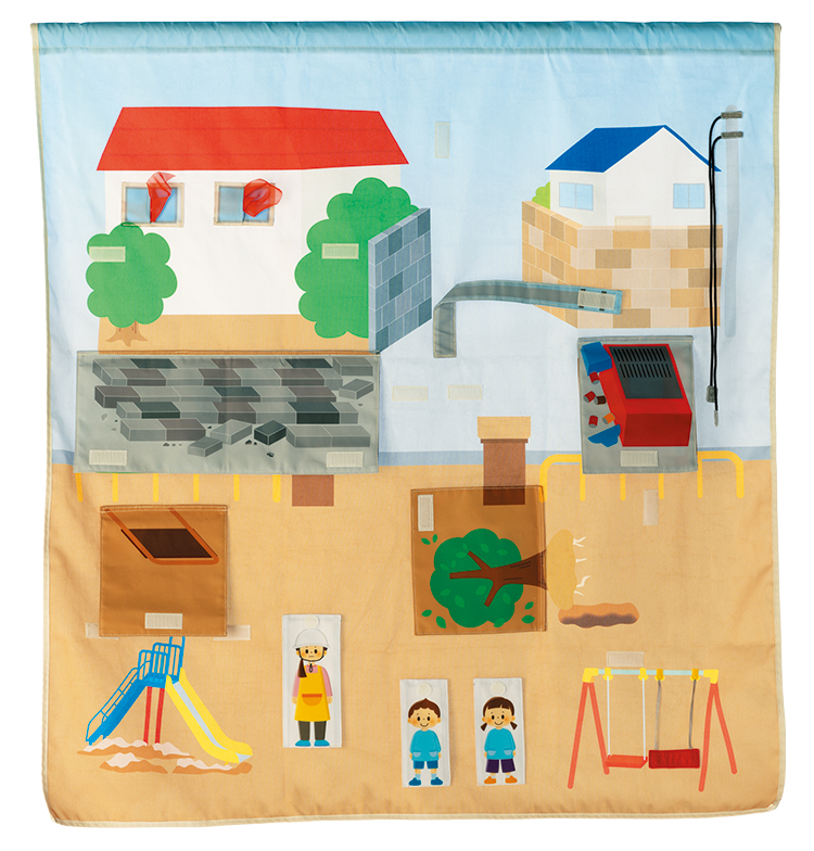 地震発生時に起こり得る状況を自然にイメージできるようになることを促す教材です。面ファスナー式のしかけがあり、子どもたちが親しみを感じながら学ぶことができます。