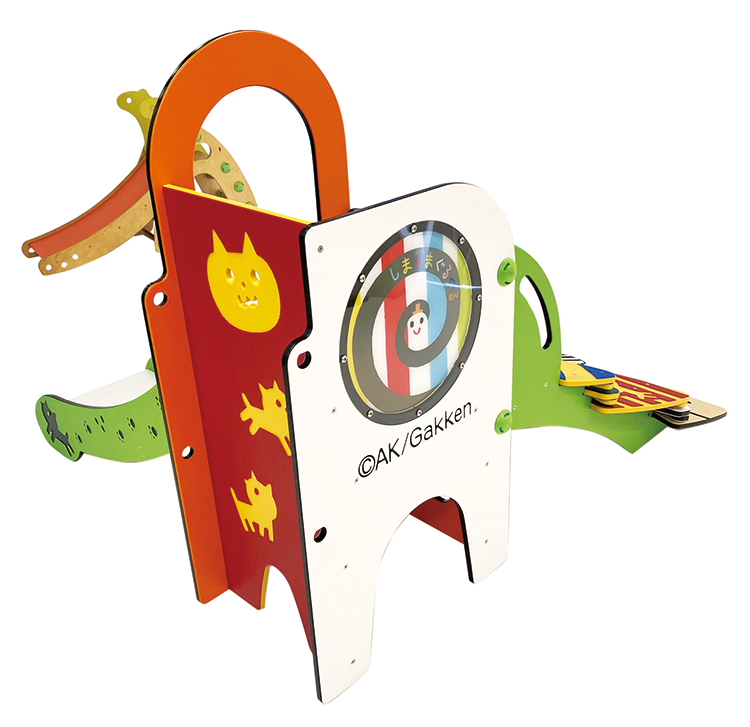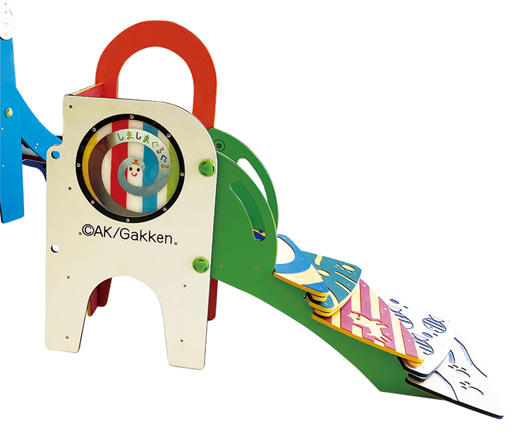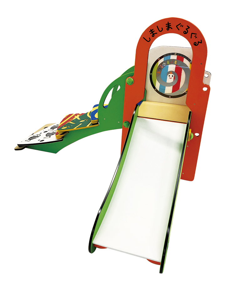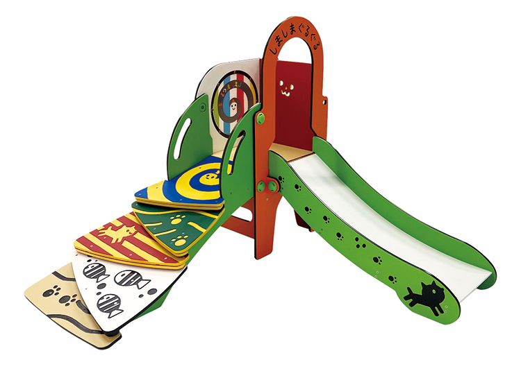 乳幼児に大人気のしましまぐるぐるがすべり台になりました。本体は樹脂パネルを使用することで色褪せも少なく、ささくれも出ません。また遊びの配置、遊具の高さも先生が介助しやすい位置に調整しております。