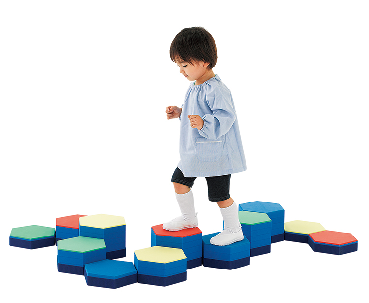 上ったり、降りたり、曲がりくねった道は子どもたちにとって遊びの王道です。組み合わせを変えて、毎回、変化に富んだ道で遊びましょう。六角ベースの周りの面ファスナーでずれることがなく、はずして片付けられます。