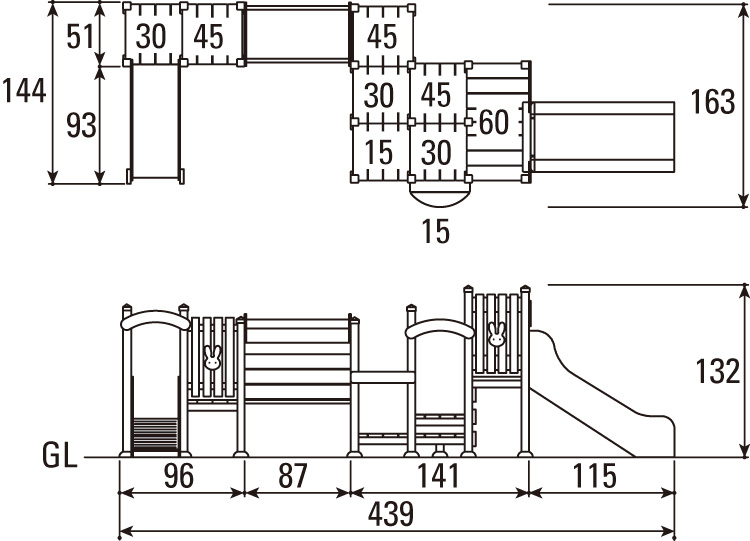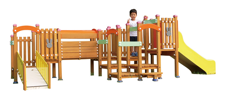 乳幼児を安心して遊ばせられる木製遊具で、ステップを登っていく道は幾通りもあります。頑張って上がれば、楽しい滑り台が待っています
