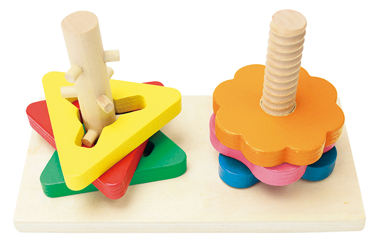 2 種類の形状の異なった棒(ツリー)に色や形の違うブロックをはめて遊びます。遊びながら違いを発見し、色と形の認識を深めるとともに「ひねる」「とおす」などの手指の発達をサポートします。