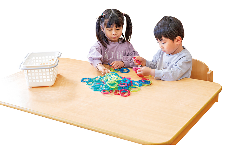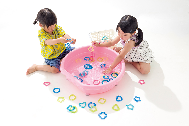 水に浮かぶ固いリングと、水に沈む柔らかいリングのセットです。浮く・沈むを予想する楽しさを味わえます。リングをつなぎ合わせてアクセサリーのようにして遊ぶこともできます。