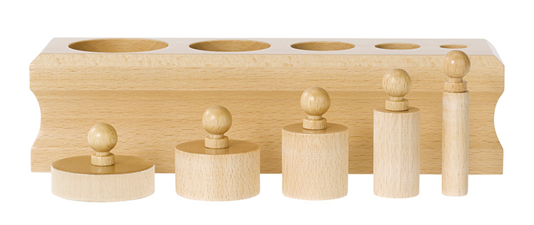 木製ブロックにつまみの付いた大きさの違う5本の円柱が納まっています(新円柱さしの5ピース版です)。高さや直径の異なる円柱を視覚で識別しながら、同じ大きさの穴にはめ込みます。
