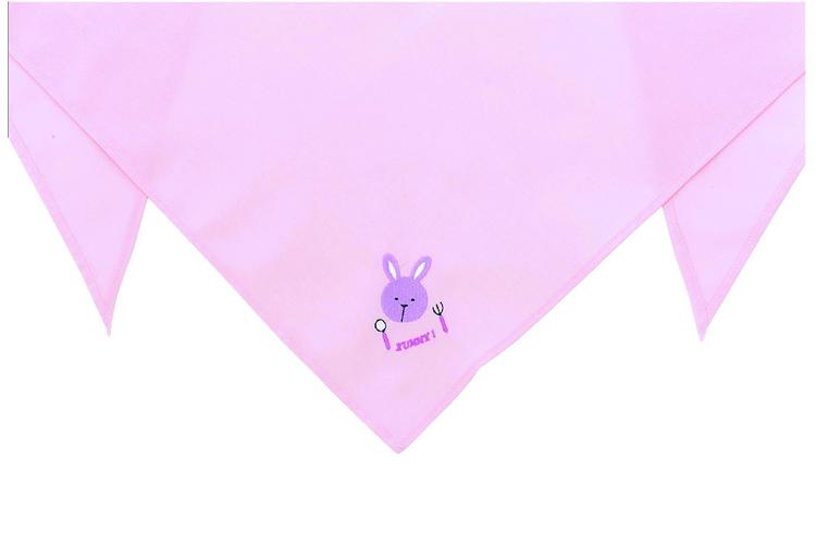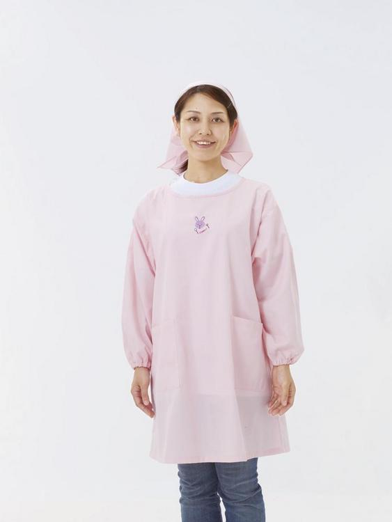三角巾の角とスモックの胸元にワンポイントの刺繍が付いたウエアで、給食の時間が楽しくなります。洗濯シワになりにくい生地を使っています。