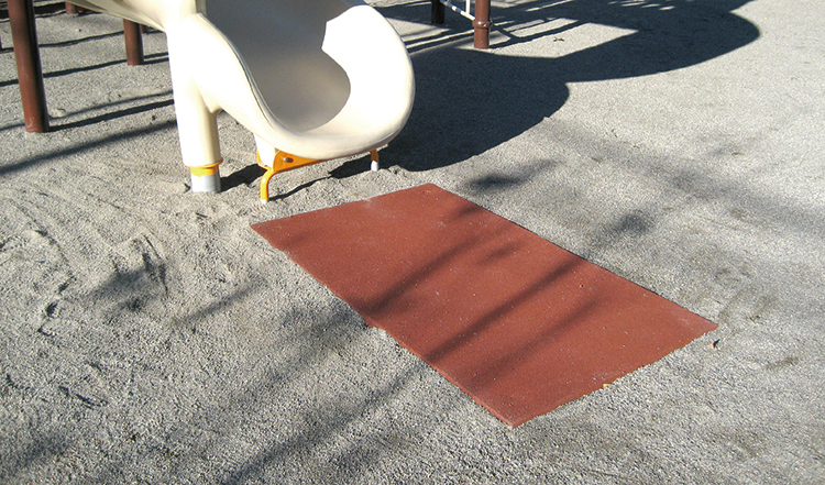 設置が簡単なゴムマットです。四方の穴に付属の杭で固定するだけで設置できます。ブランコの座面下や滑り台下などの安全マットしてお使いいただけます。