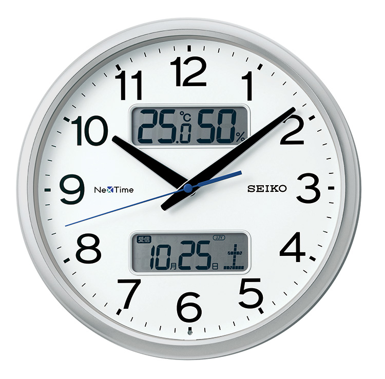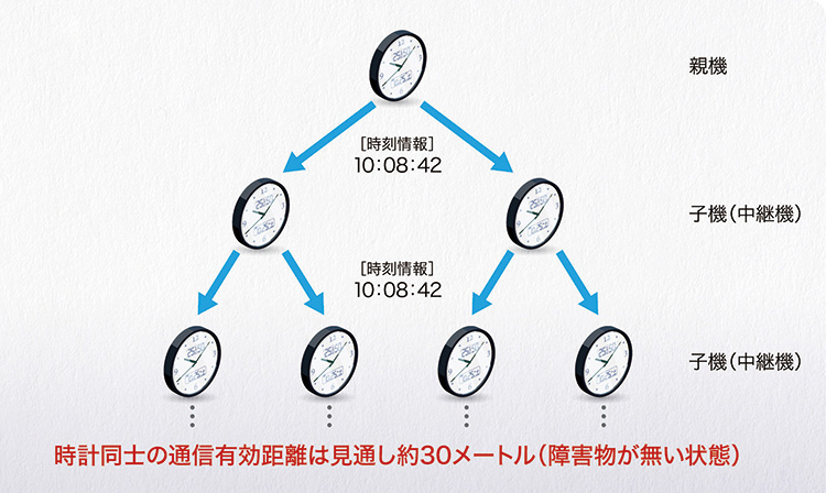 標準電波を受信し正しい時刻を表示、受信しづらい場所ではスマートフォンの時刻と同期させて正確な時刻を表示できます。更に親子時計として無線で複数の同型の時計の時刻を同期ができます。