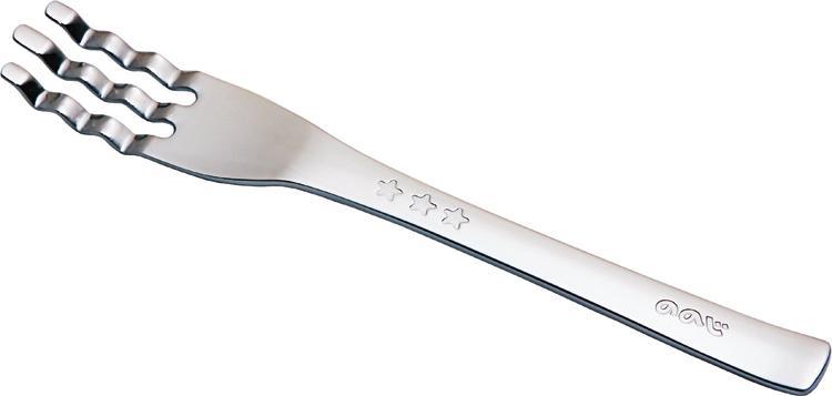 「自分で食べたい!」をという気持ちをサポートする、自立を促す子ども用のフォーク。持ち易いグリップと幅広の安定波歯のフォーク設計。いろいろなおかずが食べやすく、特に麺類の悩み解消!