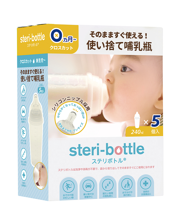洗浄や消毒が不要で、袋から取り出してそのまますぐに使用可能な「簡単・衛生的・軽い」使い捨て哺乳瓶です。乳首フード部分に余分な空気を吸い込まない工夫がされています。危機管理協会(CMA)認定品。