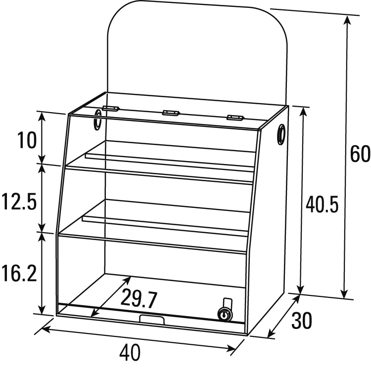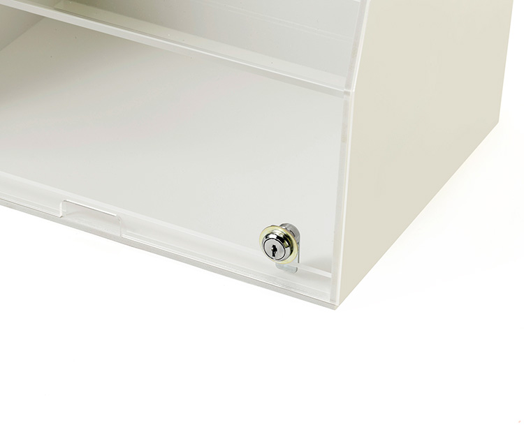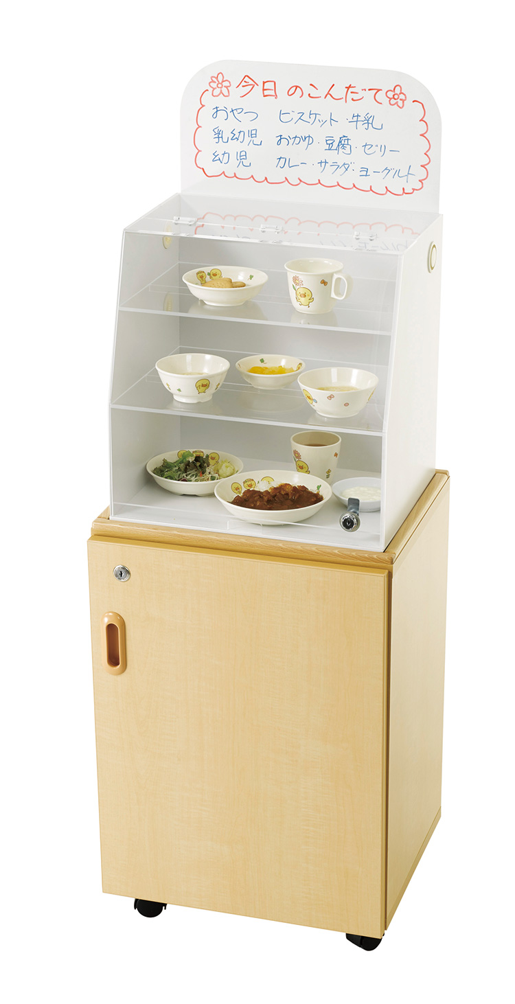 幼児、乳児、おやつが飾れる3段の献立ケースです。子どもがいたずらできないよう、鍵が付いています。ホワイトボードに献立を書き込むことができます。
