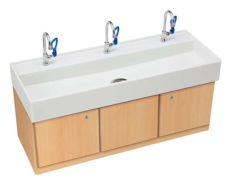 低年齢児向けのシンク高45cmと4~6歳児向けのシンク高55cmの2種類からお選びいただけます。シンクやキャビネットの扉にはケガを防止するため、角R加工を施しています。水栓は、小さな力で水が出るので、ひねる力がまだ弱い低年齢児もサポートします。キャビネットの表面は、耐水性で耐摩耗性に優れ、傷に強いメラミン化粧板を使用しており、さっと拭くだけで汚れが落とせるなどお手入れも簡単です。