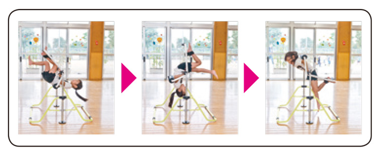 ワンタッチで鉄棒に簡単に装着でき、難しい調節もない身長110cm以下の幼児に対応した逆上がり練習器です。補助に頼ることなく一人で何度も繰り返し練習することができ、「後方回転感覚」をつかむことができます。さらに「足の蹴り出し・振り上げ感覚」も同時に養うことができます。
