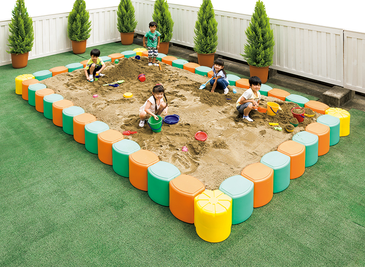 ユニットを次々に連結していくだけで、簡単に完成できる砂場です。カラフルなうえ、木の枠のように腐ることもなく丈夫で清潔です。