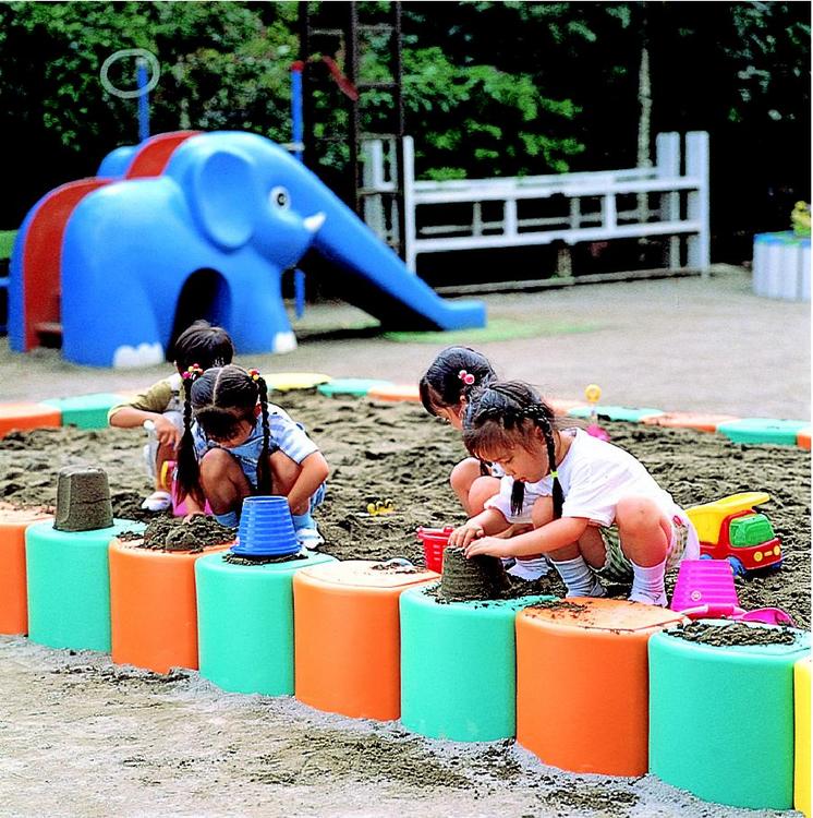 ユニットを次々に連結していくだけで、簡単に完成できる砂場です。カラフルなうえ、木の枠のように腐ることもなく丈夫で清潔です。
