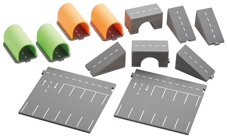 ●セット内容:追加パーツAセット= 駐車場×2・トンネル(緑・橙)各2・陸橋 パーツ(スロープA・スロープB・センター)各2