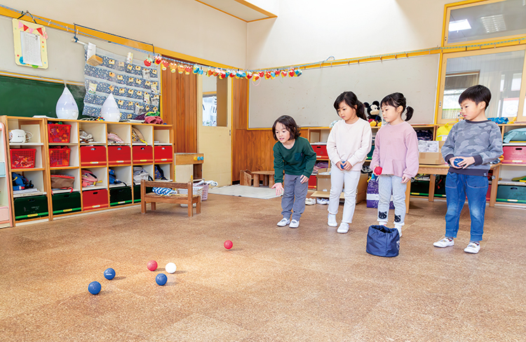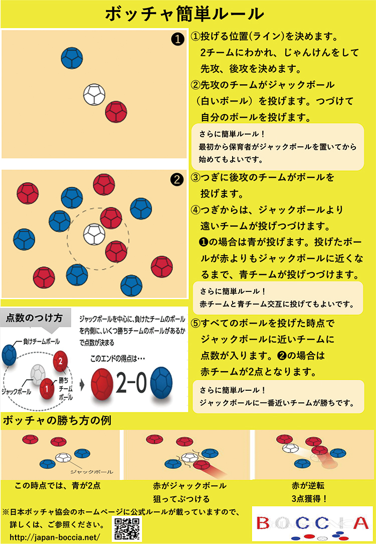 通常サイズより小さく軽いボールなので、小さな子どもでも容易にボッチャを楽しむことができ、競技スペースも省スペースで遊べます。