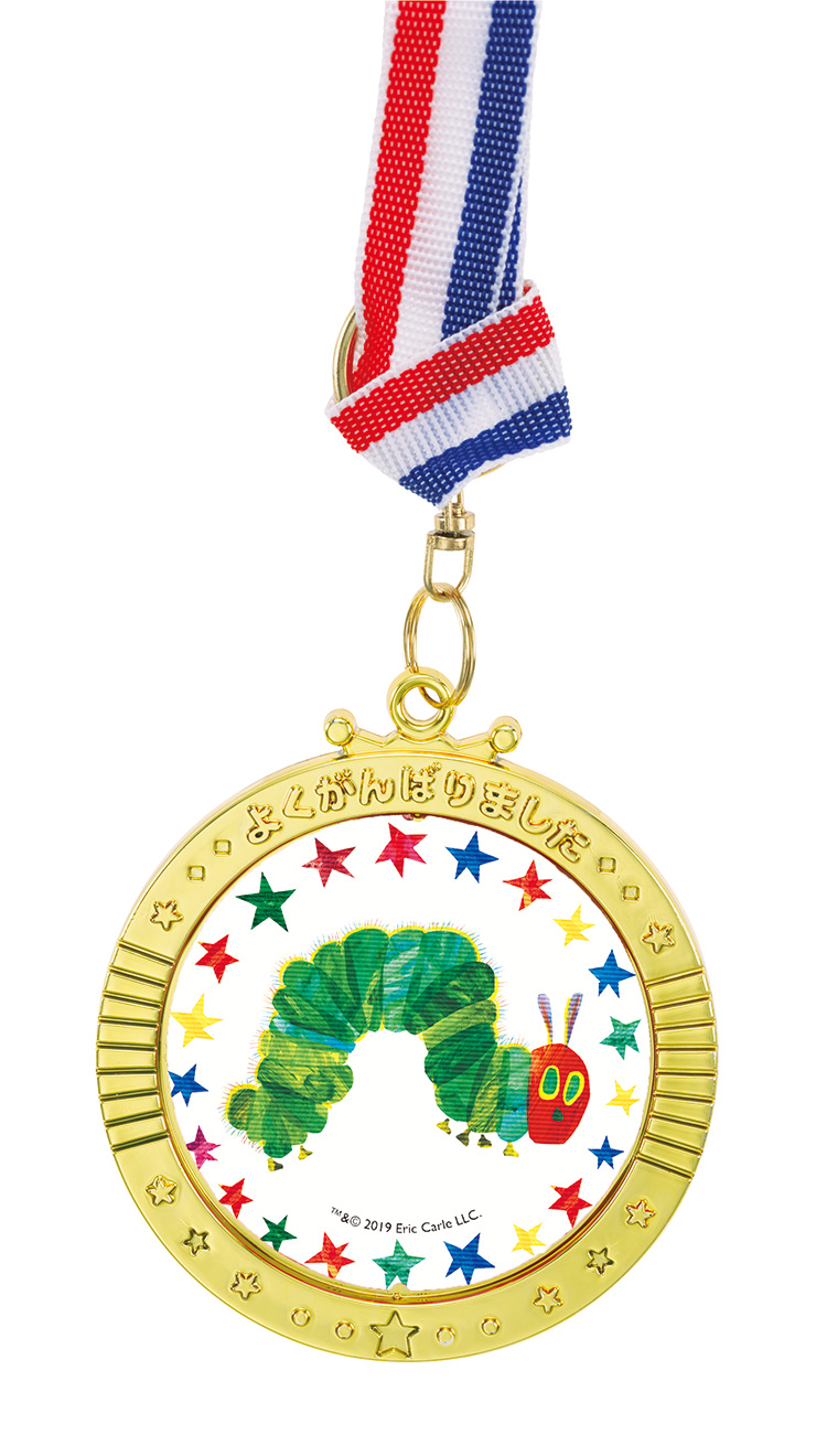 角度を変えると中央の絵柄が変わるメダルです。人気絵本「はらぺこあおむし」のイラストです。リボンを外すとキーホルダーになります。
