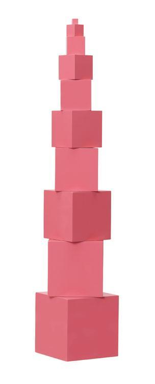 ピンク色に塗られている10個の木製の立方体です。10個の立体の1辺は1cmから10cmまで1cmずつ変化していて、縦・横・高さの3つが変化する3次元の教具です。この10個の立体を積み上げて塔を作ります。