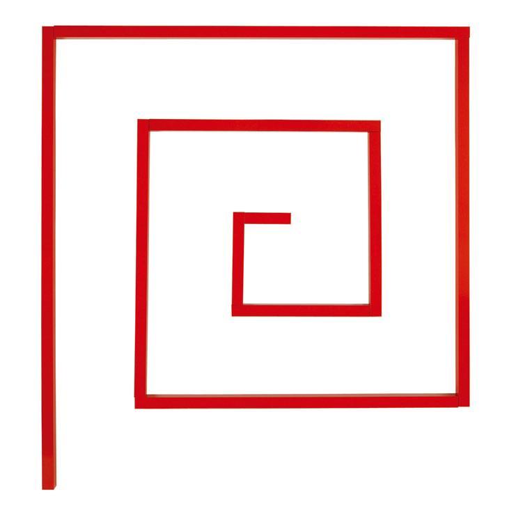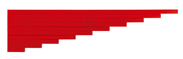 赤い色に塗られた10本の木製の細い角柱です。長さのみが10cmから100cmまで10cmずつ変化しています。長さという1次元の変化の教具です。