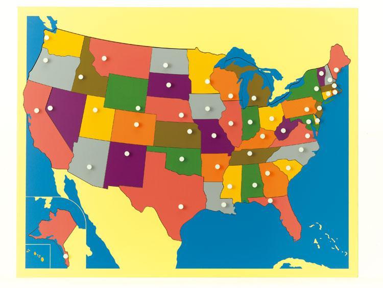 アジア、アフリカ、オーストラリア、南アメリカ、北アメリカ、ヨーロッパ、アメリカ合衆国のつまみ付地図パズルとキャビネットです。パズルは国や州などでピースが外れるようになっています。