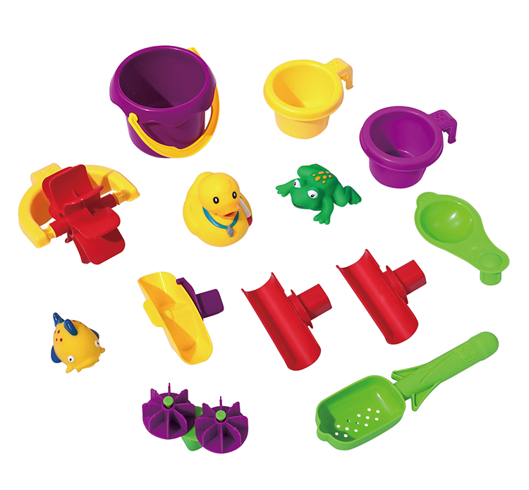 バケツを使って雨のシャワーを降らせたり、パーツを使ってさまざまな水の流れを楽しめたりします。カエルやアヒルの口が水鉄砲になります。水抜き栓付。