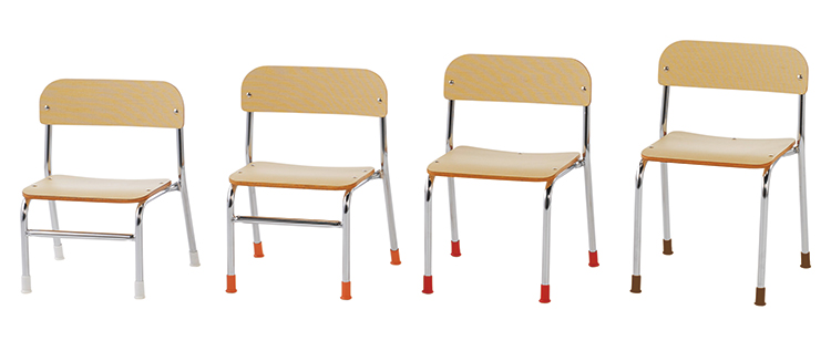 キズ、ささくれができにくい、耐久性が高いイスです。行事のときなど、異なる年齢のクラスが一緒になった場合でも見分けやすいように、各サイズで脚キャップの色を変えてあります。