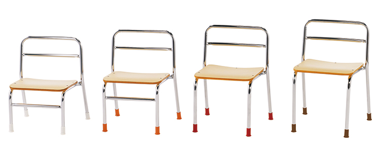 キズ、ささくれができにくい、耐久性が高いイスです。行事のときなど、異なる年齢のクラスが一緒になった場合でも見分けやすいように、各サイズで脚キャップの色を変えてあります。