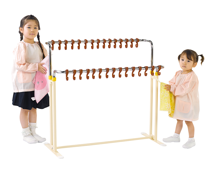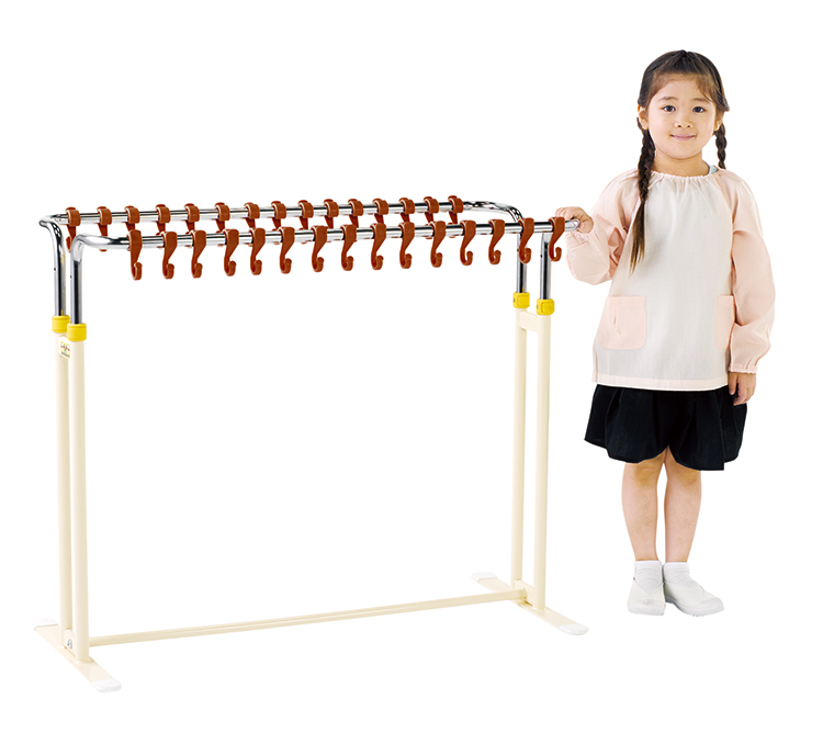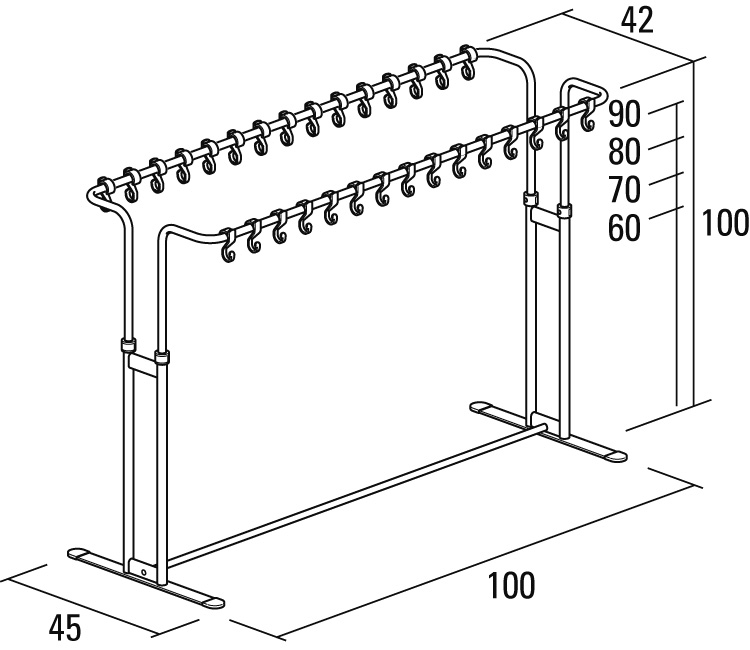 フックの高さ、向きが自在に変更できるフックスタンドです。フックの高さは60~90cmまで10cmピッチで4段階に変更できます。フックは外すこともつけることもできます。フック数30個組立式