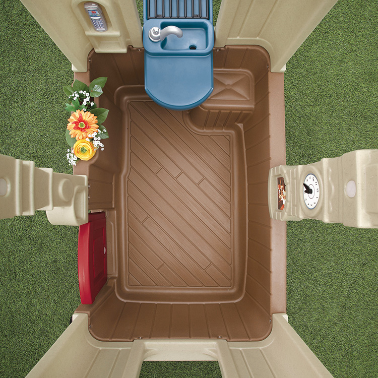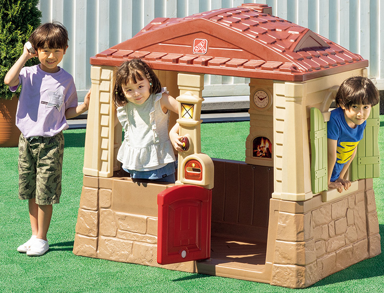 風通しがよく開放的な空間。バーベキューごっこが楽しめます。郵便ポストから手紙が入れられ、ドアベルは電池を入れると音が鳴ります。携帯電話付。