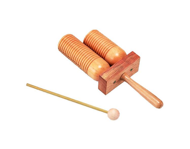 切り込みを入れた2音のブロックに柄が付いていて、たたいてウッドブロック、こすってギロになります。