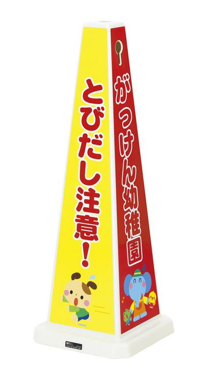 2面が園名、2面が注意表示の四角ポールです。3通りの注意表示からお選びいただけます。より注意喚起を促すパネル付を追加しました。重りは2Lのペットボトル4本、またはゴムウェイトを使用します。
