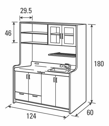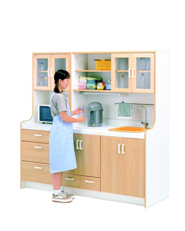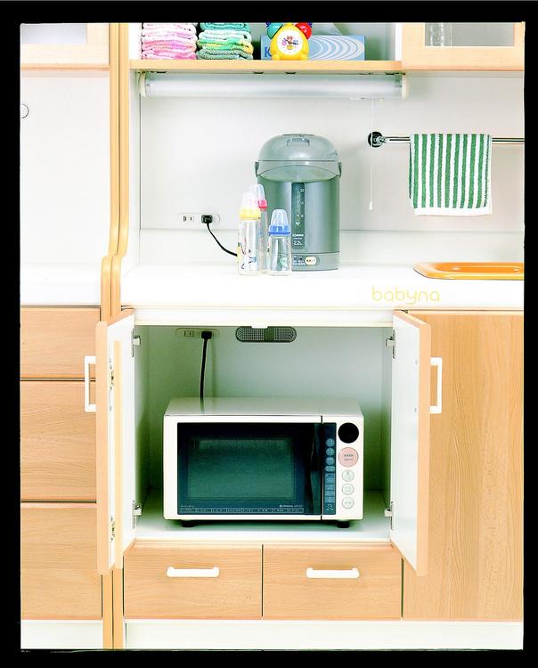 調乳・離乳食の準備ができる機能的なユニットです。湯沸かしポット用スペースには、コンセント(2口)が付いています。