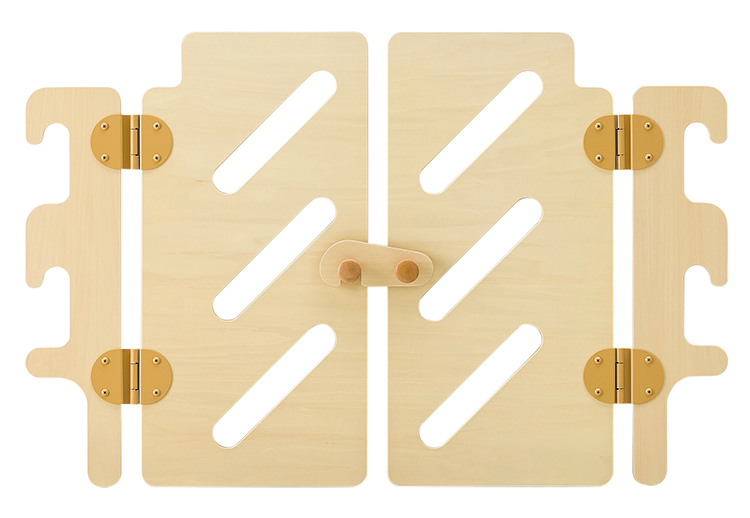 LとSの2種類の長さの違うパネル、90度~270度までさまざまな角度で連結できるアングルパネル、有効幅40~57cmまでの長さ調節ができる開口調整パネル、扉部のフラップゲートの5種類のパネルとポールの組み合わせで保育室を仕切ります。