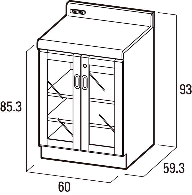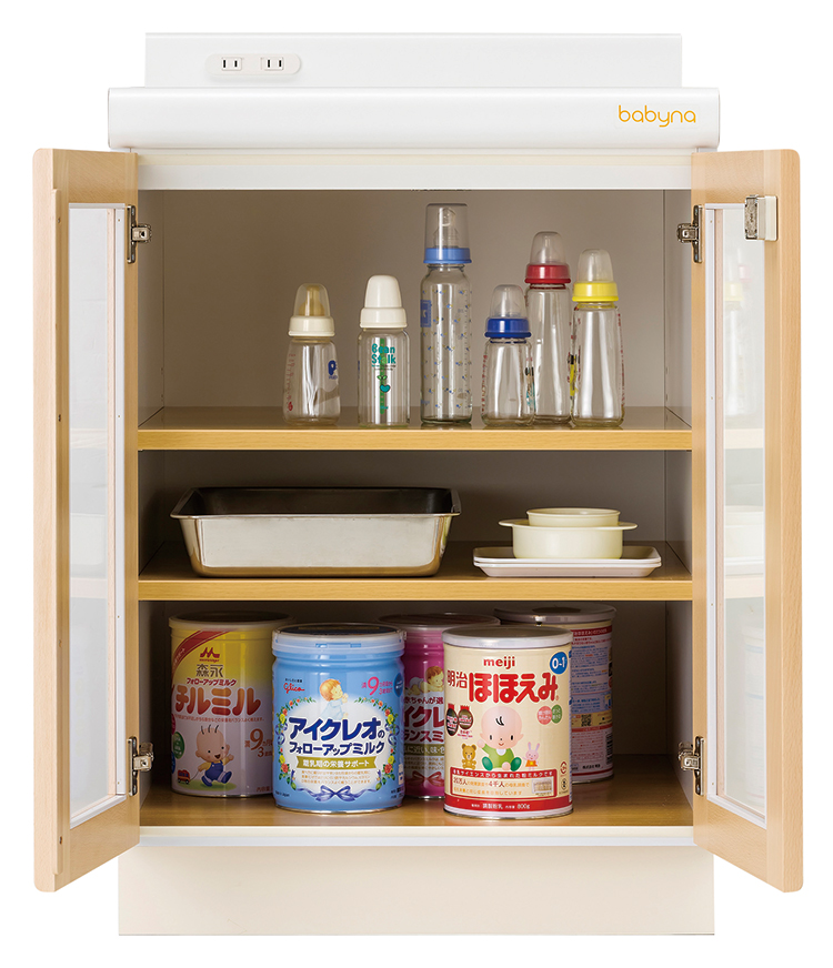 調乳室用の食器棚で扉には鍵が付いています。中に可動棚が2枚付いています。コンセントが付いており、扉は取っ手などの突起物をなくし、安全性を高めています。カウンタートップはメラミン製です。