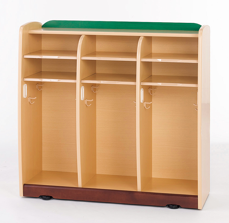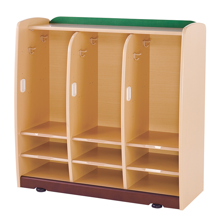 美しい木目柄にグリーンのラインが映えるちょっとシックな保育備品シリーズです。木口材に柔らかいソフトエッジを採用、丸みのあるデザインで安全に配慮しています。足元は丈夫な無垢材を使用しています。キャスター付で移動もらくに行えます。(2箇所のアジャスターを解除することで移動ができます。)