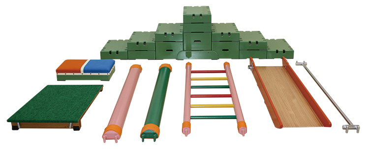 ●付属品:①小型ふた7個 ②小型枠大3個 ③小型枠小3個 ④小型頭部1個 ⑤小型とび箱台1個 ⑥小型ビーム2本 ⑦小型はしご1本 ⑧小型斜面板1枚 ⑨小型滑り面1面 ⑩小型シーソー1台