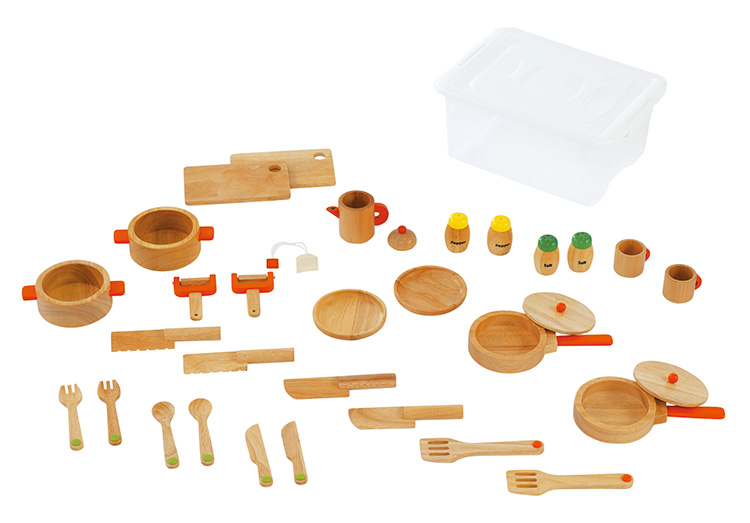 ●セット内容: ピーラー・フライパン・おなべ・塩こしょうセット・フライ返し・まな板・包丁・パンナイフ・マグカップ・お皿・スプーン・ナイフ・フォーク 各2個・ティーポット1個・ティーバッグ1個・収納用プラケース1個●対象年齢:2歳〜●材質:天然木●寸法:収納用プラケース=34×24.5×高さ15.5cm
