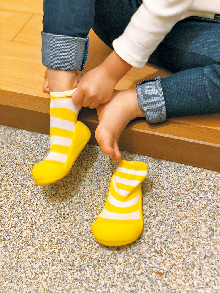 靴下のようにはける、幼児用の防災靴です。靴底がゴムになっていて、足元を保護します。防災靴の予備としてもご利用いただけます。