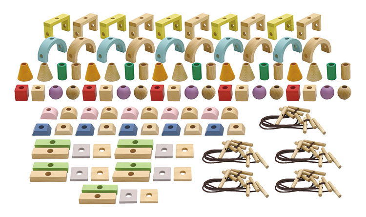 ひもの両端がストッパーになるので、ピースを通して作ったものを持ち歩いても崩れません。ひもにピースを通すことが目的のひも通しおもちゃと違い、ひもとピースで「あそび道具」を作ることがコンセプトのひも通しおもちゃです。シンプルな形のピースはいろいろなものに見立てる想像の余白を残したデザインとなっています。