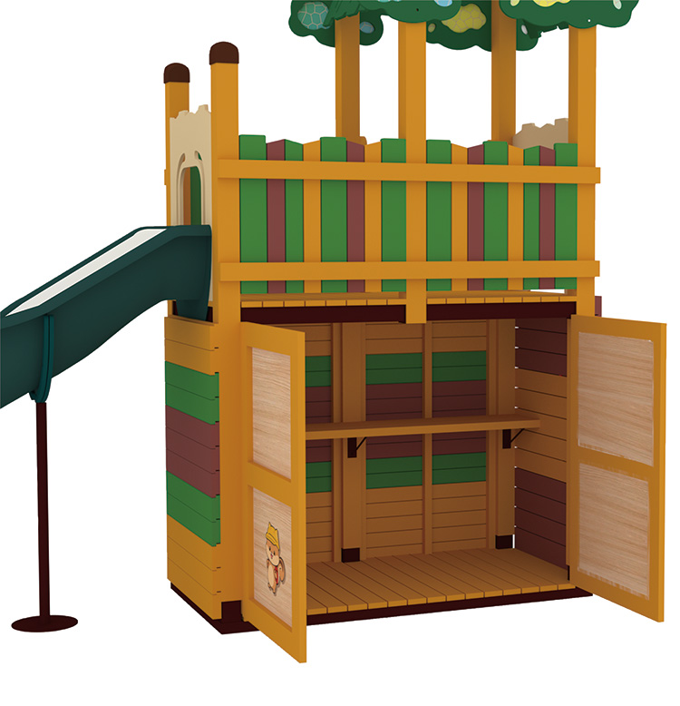 防災用品を遊具デッキ下に収納できる木製遊具です。日常では子どもたちの豊かな育ちを支える遊具として、また、災害時に必要なテントや工具などを収納しておけます。